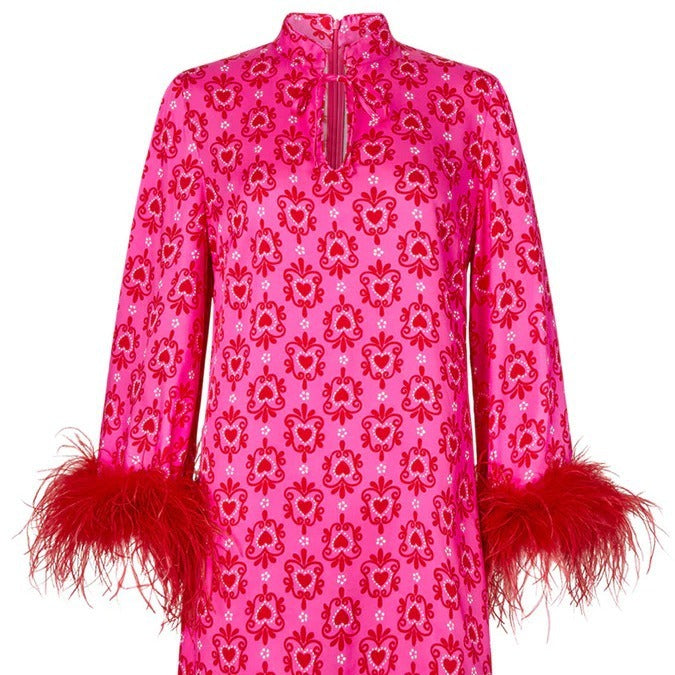 Abito elegante con collo alto , fantasia, con piume S,M,L,XL